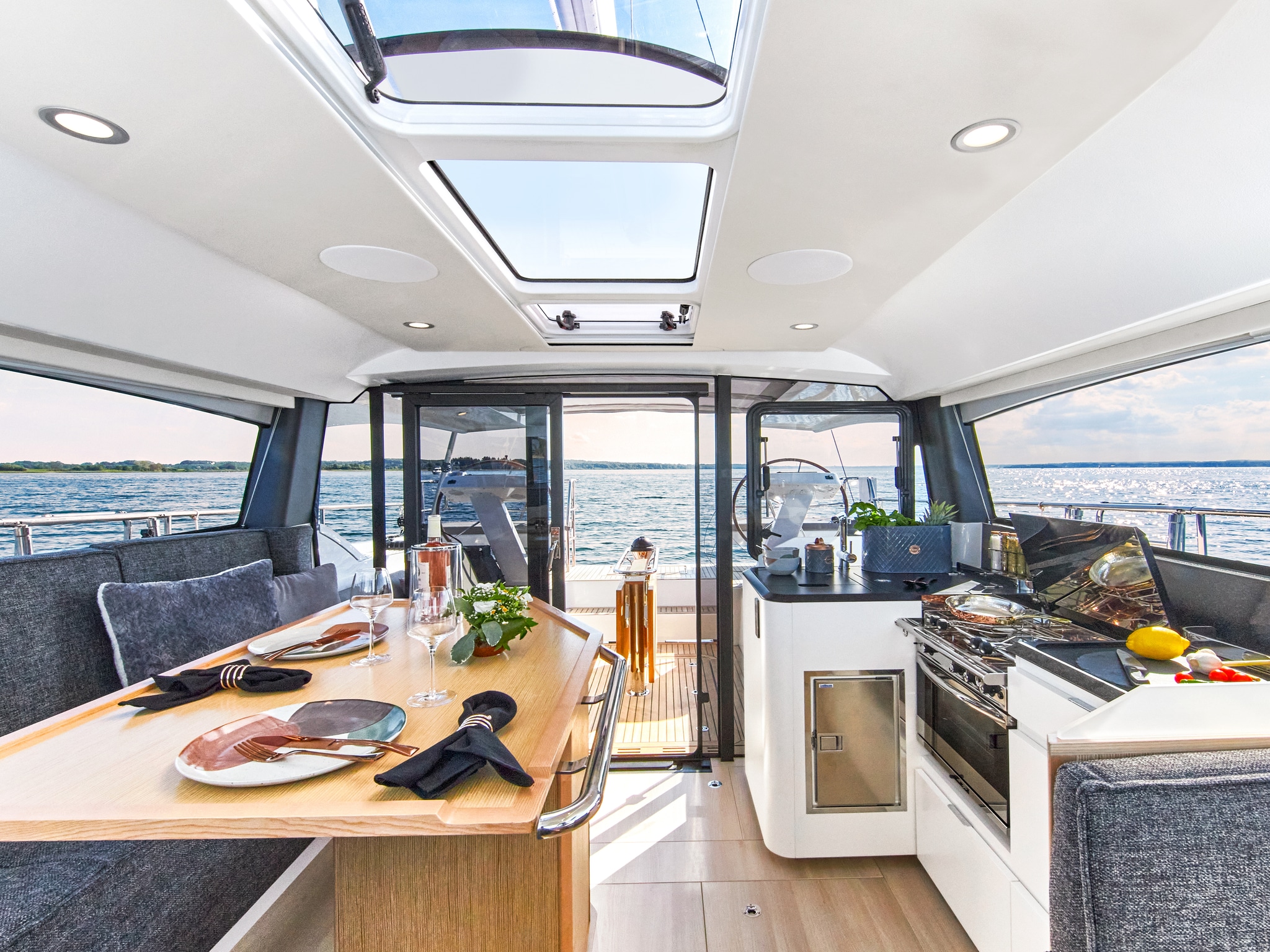 Moody takes a unique approach to modern yacht building with the "One Level Living" concept. Our craftsmanship redefines fluidity, elegantly erasing boundaries between indoor and outdoor experiences. Deck saloons with panoramic windows and sliding doors connect everybody on board with nature even when being inside.